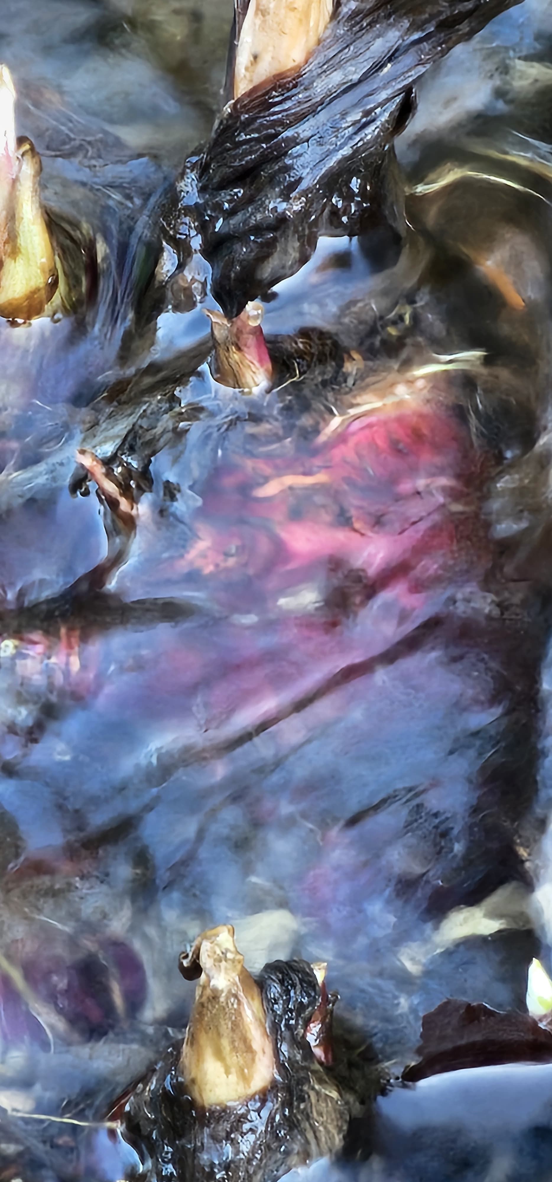 Zeit als man die Blätter auf die Pestbeulen zur Schmerzlinderung gelegt hat). Früher hat man die großen Blätter tatsächlich genutzt, um sich vor der Sonne zu schützen. In der Kindheit ist man da wohl noch intuitiv näher an der Natur und den Dingen …. Als Kind habe ich mich aber immer nur an den Rand der von der Pestwurz meist großen bewachsenen Fläche getraut, weil es mir immer ein bisschen unheimlich war, dort rein zu gehen. Die Pflanzen werden bis sechzig Zentimeter groß, wachsen dicht an dicht und irgendwie war ein Vibrieren in den Pflanzen, das mich immer an Schlangen hat denken lassen. Und wie ich dieses Jahr im frühen Januar an einem kleinen Bach in der Fränkischen vorbeispaziert bin, ist es mir plötzlich klar geworden, was da unter den großen Blättern so unheimlich war. Im fließenden eiskalten Wasser des Baches war der fleischig-rote Wurzelstock der Pestwurz zu sehen (Abb 1).